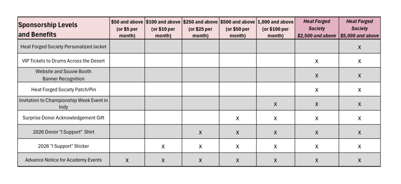 Would you consider… This season we ask you to join our ‘Heat Forged Society.’ The Heat Forged Society is an exclusive group of supporters who commit to giving $2,500 or more to support the Academy Drum and Bugle Corps.